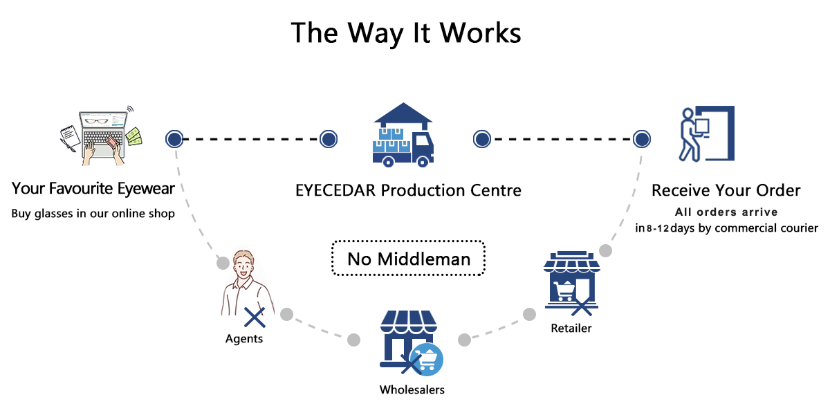Wir arbeiten ohne Distributoren und Händler und liefern direkt von der Produktionsstätte zu Ihnen, wodurch viele der traditionellen Kosten entfallen. Diese Einsparungen von bis zu 65 % geben wir direkt an unsere Kunden weiter, so dass Sie die gleichen Brillen wie in Ihrem örtlichen Geschäft zu einem Bruchteil des Preises erhalten.